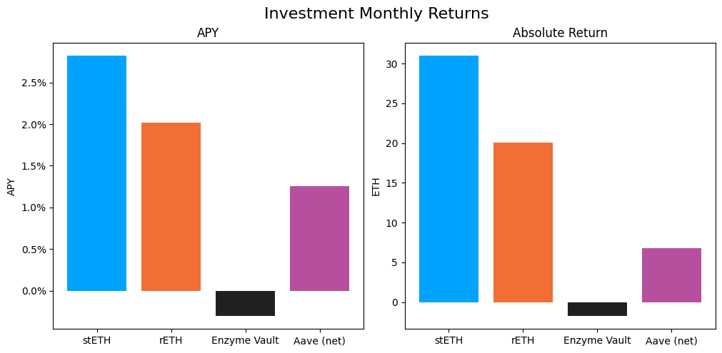 Active staking investments yielded between -0.3% and 2.8% APY, showing healthy ETH staking returns despite market conditions. The negative returns in the Enzyme vault were a result of slight volatility in the eETH/ETH price. The Aave USDC debt position, using ETH as collateral, produced a net APY of 1.25%. Overall, based on the average Capital Pool value for the month, investments returned 1.3% APY.