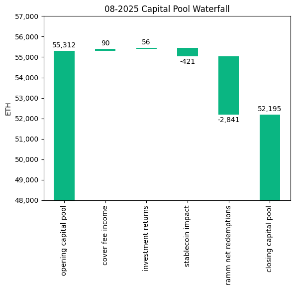 The Capital Pool decreased by 5.63% in ETH terms this month, dropping from 55.3k to 52.2k ETH. Withdrawals through the RAMM, totaling 2.8k redemptions, remained the primary factor. The 19% increase in ETH price over the last month created a negative FX impact on our stablecoin holdings. However, Cover Fees and Investment holdings made positive contributions to the pool’s value.