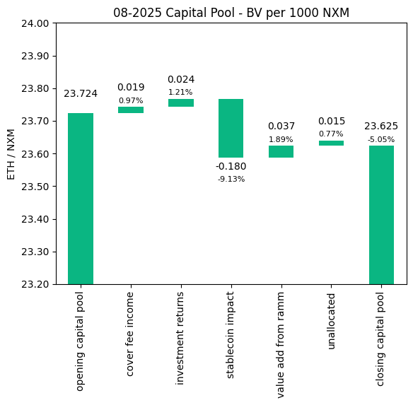 The Capital Pool’s ETH/NXM value decreased from 0.02372 to 0.02363, a 5.05% annualised decline for the month. This reduction primarily stemmed from the negative FX impact on stablecoin holdings, though value added through RAMM, Cover Fees, and Investment returns partially offset this decline.