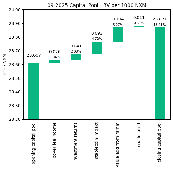 The Capital Pool’s ETH/NXM value rose from 0.02360 to 0.02387, representing a 13.41% annualized increase for the month. This growth primarily resulted from two factors: the significant positive FX impact from stablecoin holdings and substantial value added through the RAMM.